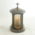 • Shape: round, barrel-shaped lamp • Material: polished granite base, brass-colored aluminum body • Decoration: Cross • Height approx. 22 cm (with cross approx. 28 cm), Ø approx. 15 cm • For candles up to H 13 cm, Ø 6.5 cm • Surface highly polished and easy to clean • Weatherproof, frost-resistant, durable