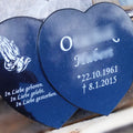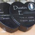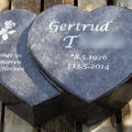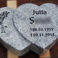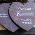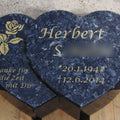 Our Double Heart is lovingly crafted from various types of granite and offers space for a personalized engraving. The polished surface and gently rounded edges give the stone a refined appearance. Engraving of the first and last name, as well as the date of birth and death, is included; additional names or a sympathy message are also possible. We also offer optional ornaments, image engravings (only for Swedish Black), and applied lettering for a personalized touch.