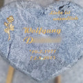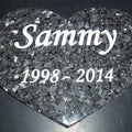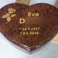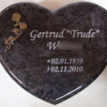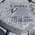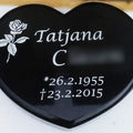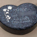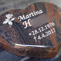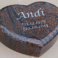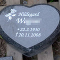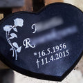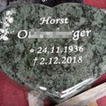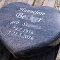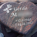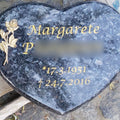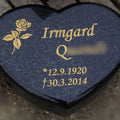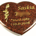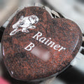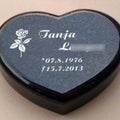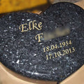 Our heart plaque is lovingly crafted from various types of granite and offers space for a personalized engraving. The polished surface and gently rounded edges give the stone a refined appearance. Engraving of the first and last name, as well as the date of birth and death, is included; additional names or a sympathy message are also possible. We also offer optional ornaments, image engravings (only for Swedish Black), and applied lettering for a personalized touch.