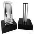 This four-piece set, available in various granite colors, combines the rectangular stainless steel "Royal" lamp without a cross on the glass door with a round stainless steel vase. The vase features a drainage hole and a removable plastic insert; the insert is removed in winter to allow water to drain away and prevent the vase from bursting in frost. The lamp and vase each stand on pre-drilled granite bases for easy installation.
